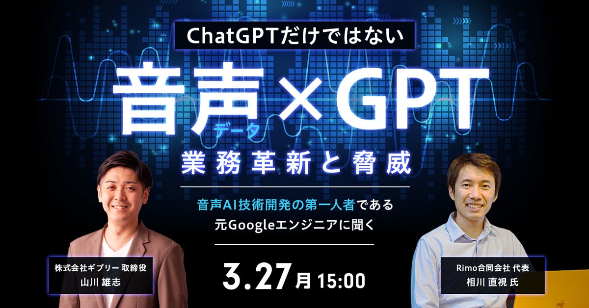 AIチャットボット、AI-FAQなどの業務自動化ソリューションを提供する株式会社ギブリー(本社:東京都渋谷区、代表取締役社長:井手高志、以下ギブリー)は、音声AI技術開発の第一人者の元Googleのエンジニアで、現在Rimo合同会社代表の相川直視氏を迎え、音声データとChatGPTによる業務の革新と脅威について語るオンラインウェビナーを、2023年3月27日(月)に開催いたします。
