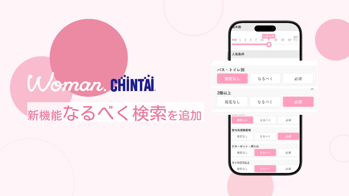 一人暮らしの女性向けお部屋探しアプリ『Woman.CHINTAI』に新機能を追加し、より使いやすくリニューアル!今回のアップデートでは、「なるべく検索」機能を新たに実装。希望条件を設定する際に、「必須」「なるべく」「指定なし」の3段階から優先度を選べるようになりました。これにより、譲れないこだわりはそのままに、柔軟にお部屋を探すことが可能に。これまで条件から外れていたお部屋とも出会いやすくなり、理想の暮らしに近づくチャンスが広がります。選択肢を広げながら、自分にぴったりの暮らしを見つけたい方は、ぜひ『Woman.CHINTAI』アプリをお試しください。