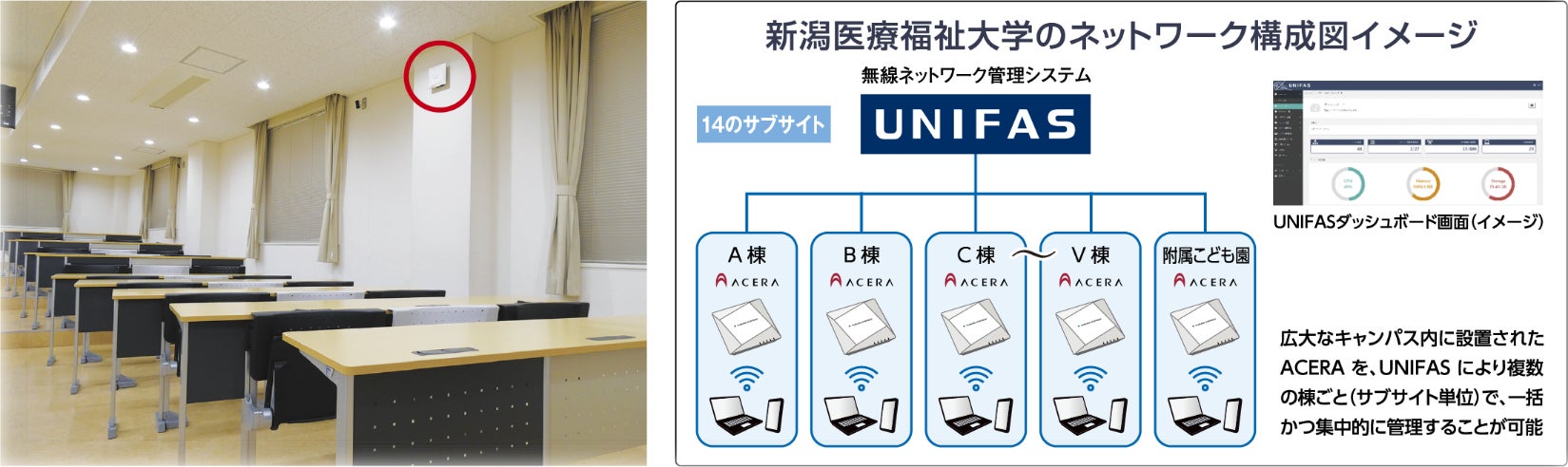 業務用無線機器メーカーの株式会社フルノシステムズ(本社:東京都墨田区、代表取締役社長:中谷聡志、古野電気㈱関連会社)は、学校法人 新潟総合学園 新潟医療福祉大学(新潟県新潟市北区)のキャンパスネットワーク整備において、業務用無線LANアクセスポイント「ACERA(アセラ)」と無線ネットワーク管理システム「UNIFAS(ユニファス)」を採用いただきました。ACERAの導入により、学内のどこにいても快適につながる通信基盤が構築され、UNIFASによって広大なネットワークを安定的に管理できる体制が整いました。