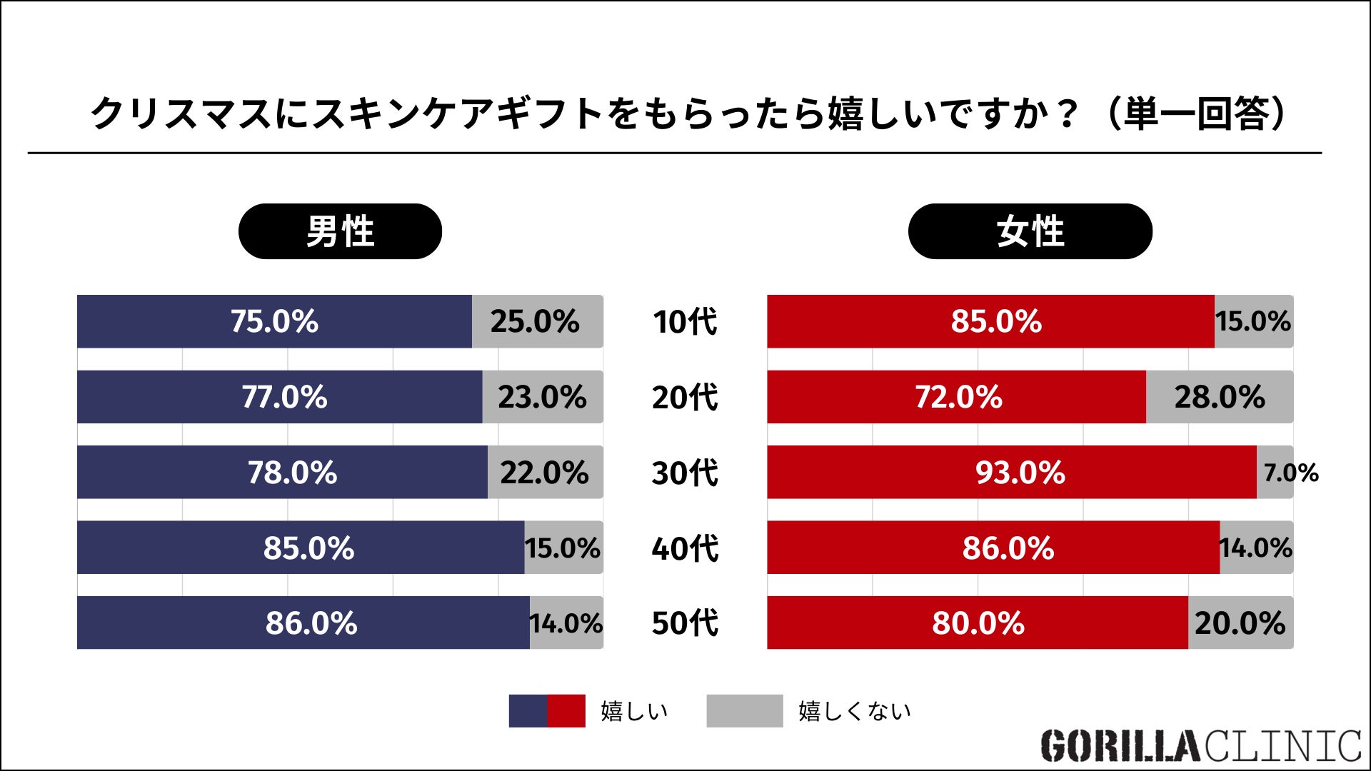 こうした変化を受け、全国23院展開する男性専門の総合美容医療「ゴリラクリニック」(医療法人社団十二会/東京都新宿区、稲見文彦総院長、以下「当院」)は、2025年11月26日~28日の3日間、10~50代の男女1,000名を対象に【クリスマスギフトと冬の乾燥に関する意識調査】を実施しました(インターネット調査)。
