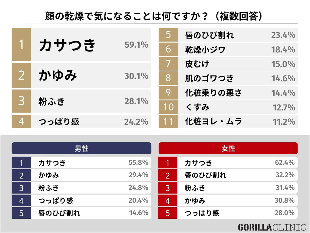 なお、「今まで乾燥が気になったことがあるか?」の質問に対しては、8割以上が「ある(84.7%)」と回答。本リリースでは季節柄気になる【冬の乾燥対策について】、ゴリラクリニック銀座ANNEX院院長 太田博之医師が解説します。