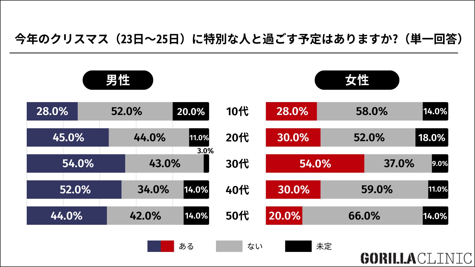 男女別では女性(54.4%)が男性(43.0%)を11ポイント以上上回っており、女性の方が予定なしの割合が高いです。男性は予定あり(44.6%)と予定なし(43.0%)がほぼ拮抗しているのに対し、女性は予定なしが過半数を占めており、男女間でクリスマスの過ごし方に対する状況や意識に違いが見られました。