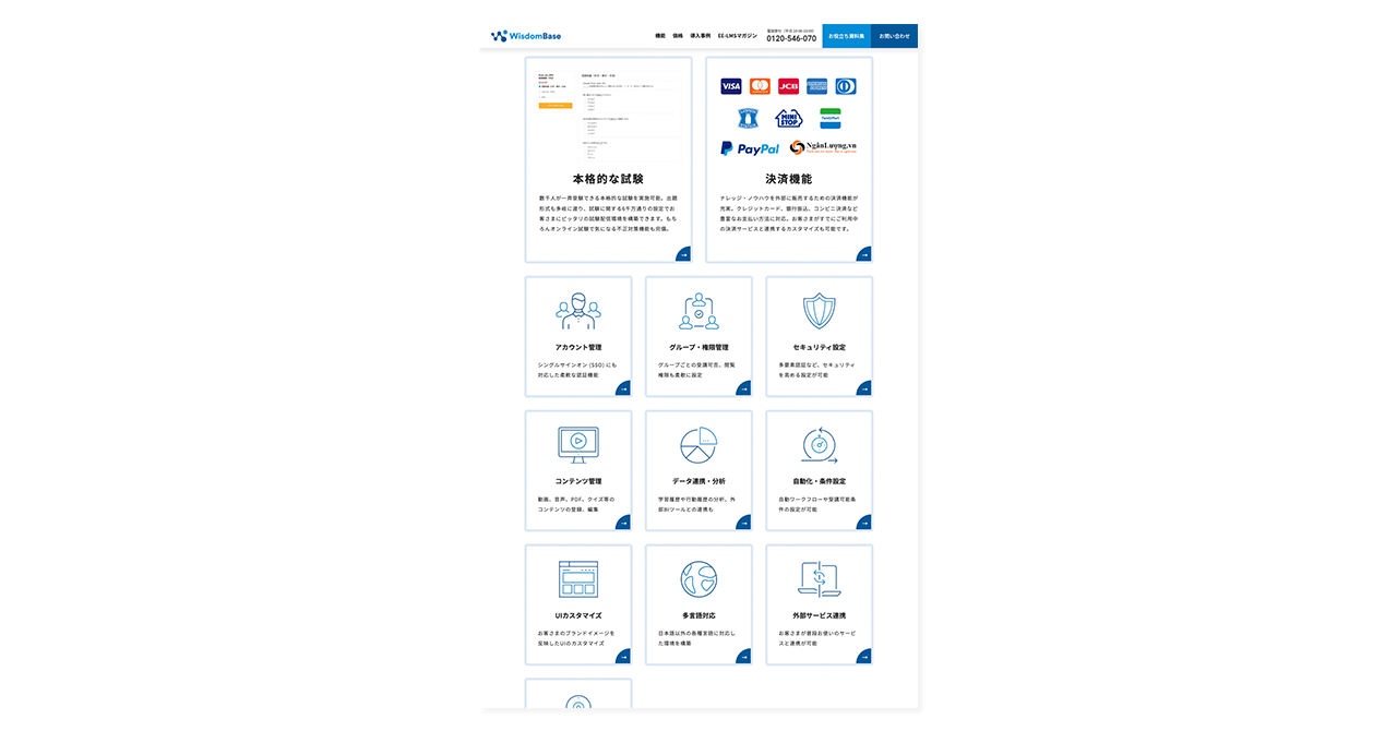 リニューアル前のサービスサイトでは、試験機能やEC機能などWisdomBaseの強みや利便性を伝えるためのコンテンツが不足していました。特に導入事例については、検定試験のオンライン化やオンライン講座の販売など、幅広いユースケースをご紹介できていませんでした。