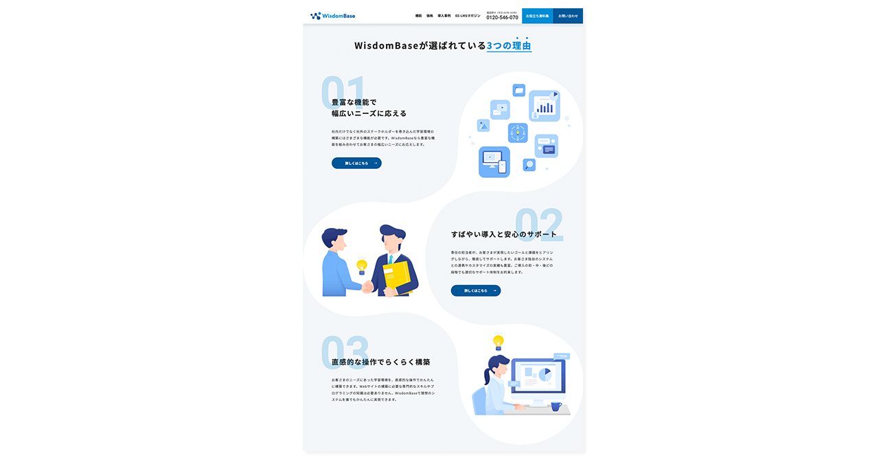 TOPページでは、WisdomBaseの特長を3つにまとめて分かりやすく説明しています。