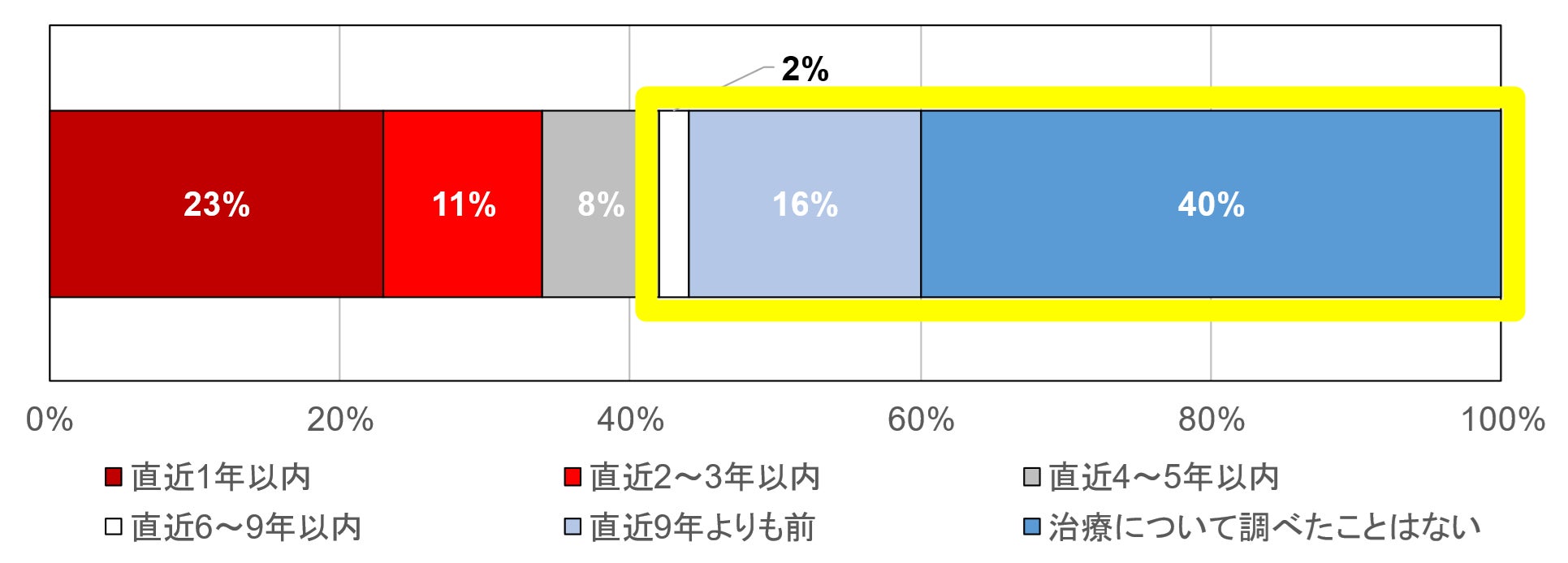 アトピー性皮膚炎の治療薬について最後に調べた時期を質問したところ、「直近6~9年以内」「直近9年よりも前」「治療について調べたことはない」と、患者さんの58%が回答しました(図3)。約6割の患者さんが、治療薬について全く調べたことがない、もしくは5年以上調べていないことがわかりました。