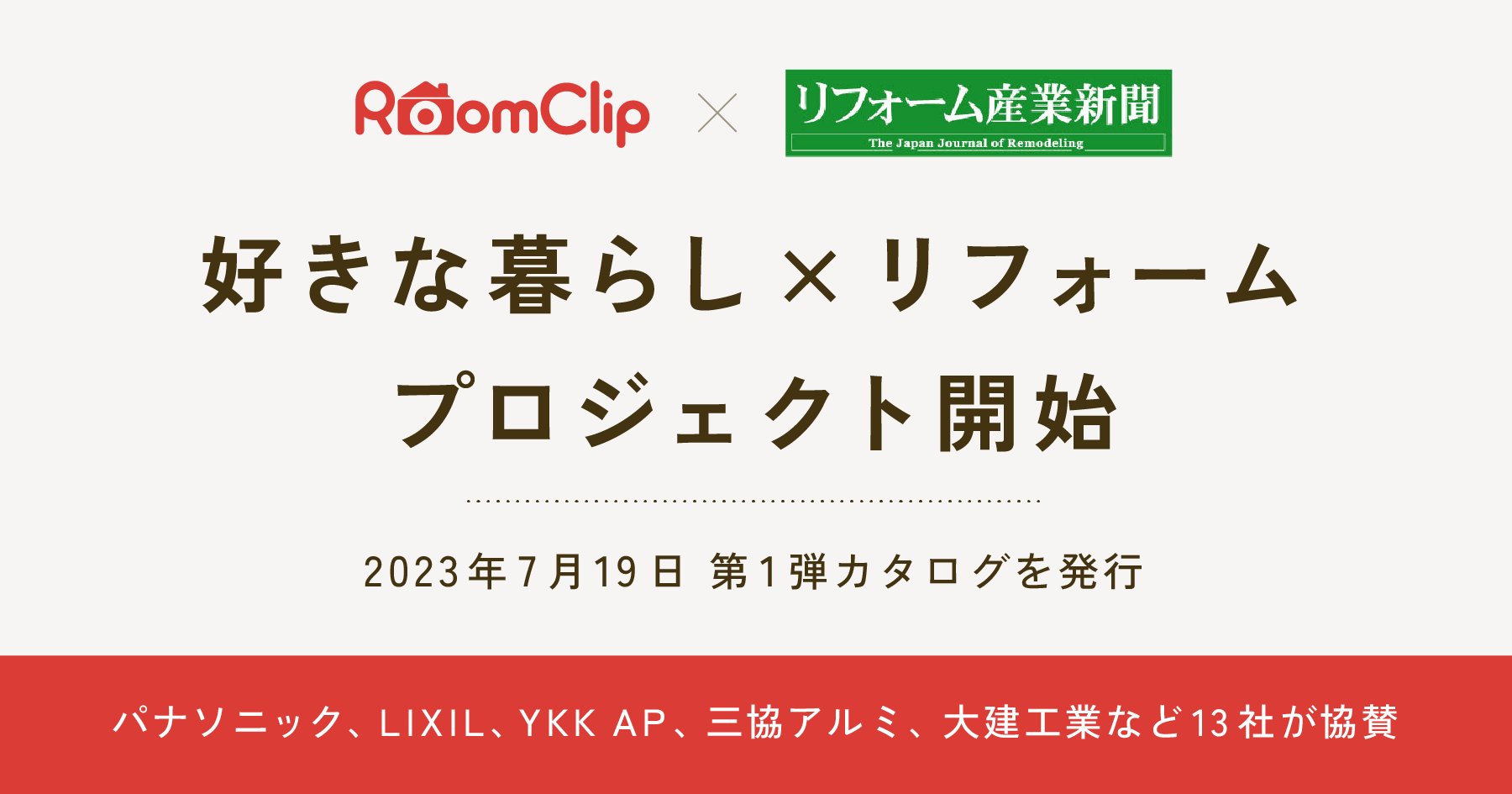 ルームクリップ株式会社(本社:東京都渋谷区、代表取締役CEO:髙重正彦)は、提供するサービスである、住生活の領域に特化した日本最大級のソーシャルプラットフォーム「RoomClip(ルームクリップ)」において、リフォーム産業新聞(本社:東京都中央区、代表取締役社長:加覧 光次郎、以下 リフォーム産業新聞)と共同でリフォームを促進するプロジェクト「好きな暮らし×リフォーム」(以下、本プロジェクト)を開始します。第1弾として13社の協賛のもと、好きな暮らしの実例からリフォームを提案するカタログを2023年7月に発行いたします。