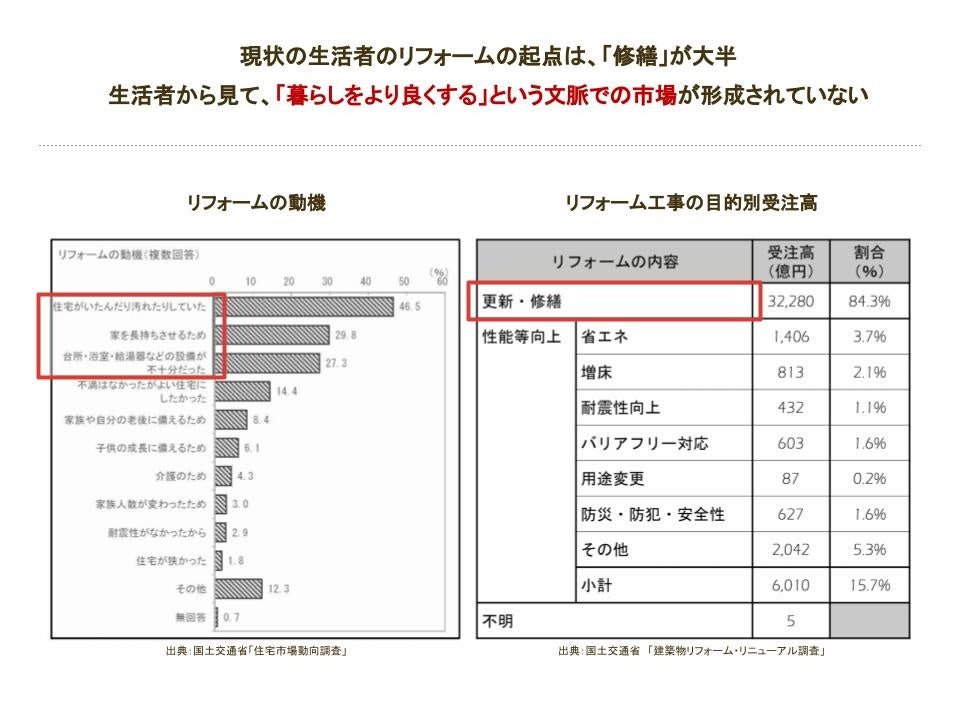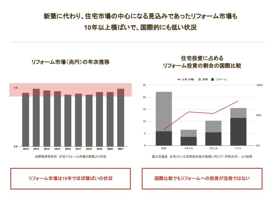 しかしながら、住宅市場の中心となると注目されていたリフォーム市場は10年以上横ばいの状況が続いており、国際的にもリフォームへの投資は低い状況が続いています。