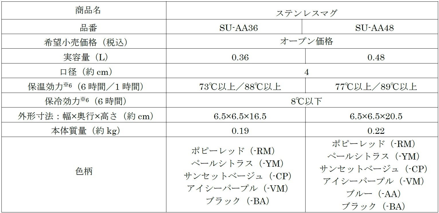 ステンレスマグ | SU-AA | 0.36L/0.48L | オープン価格 | 2024年9月1日 |