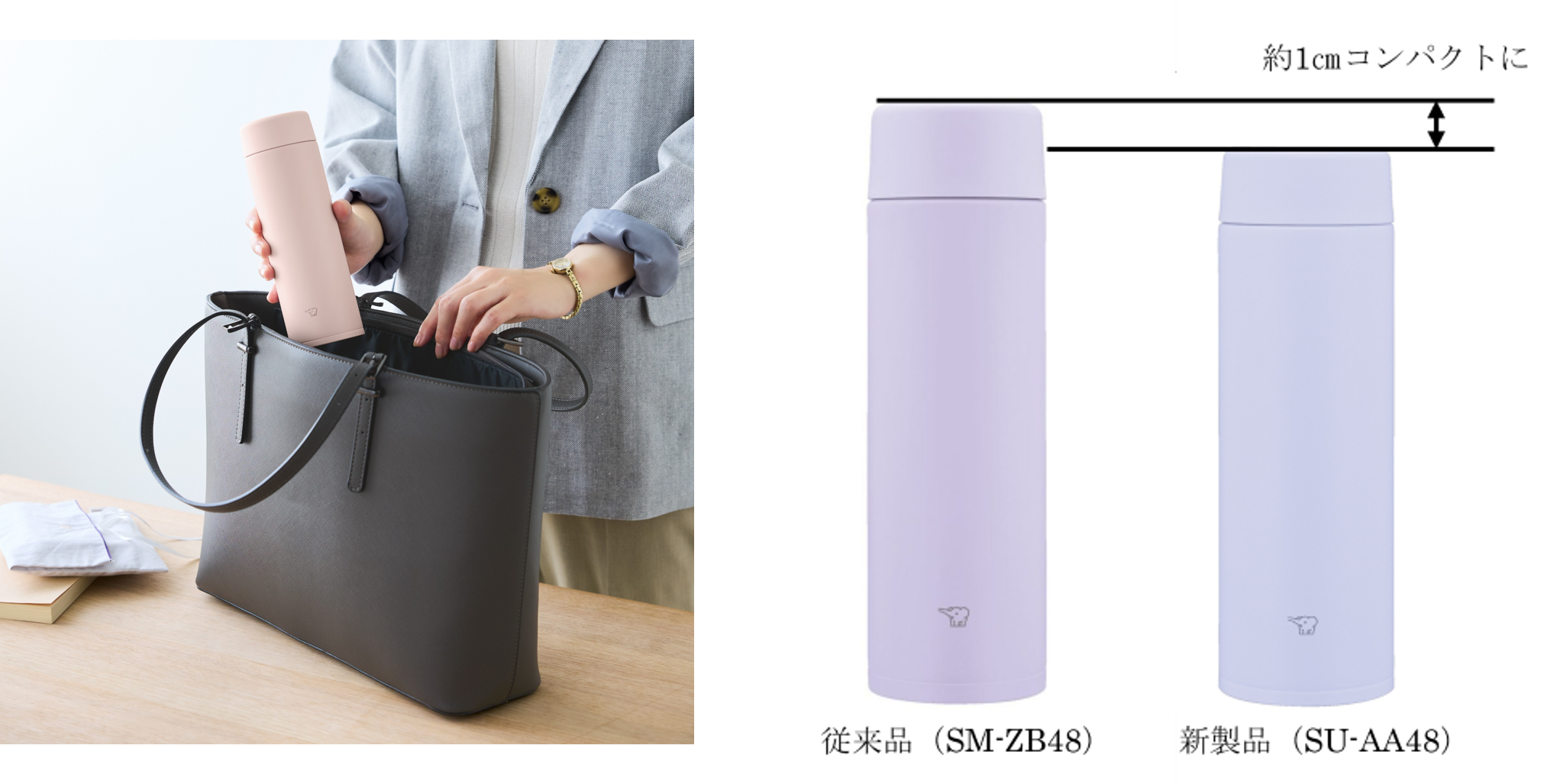 新製品は、内側からの放熱を抑える独自の加工技術「サーモリング構造」の搭載により6時間後の保温力※2が約6℃向上※3し、象印史上最高の保温力※1を実現。構造を見直したことで本体は約1㎝※4コンパクトになり、さらに持ち運びしやすくなりました。