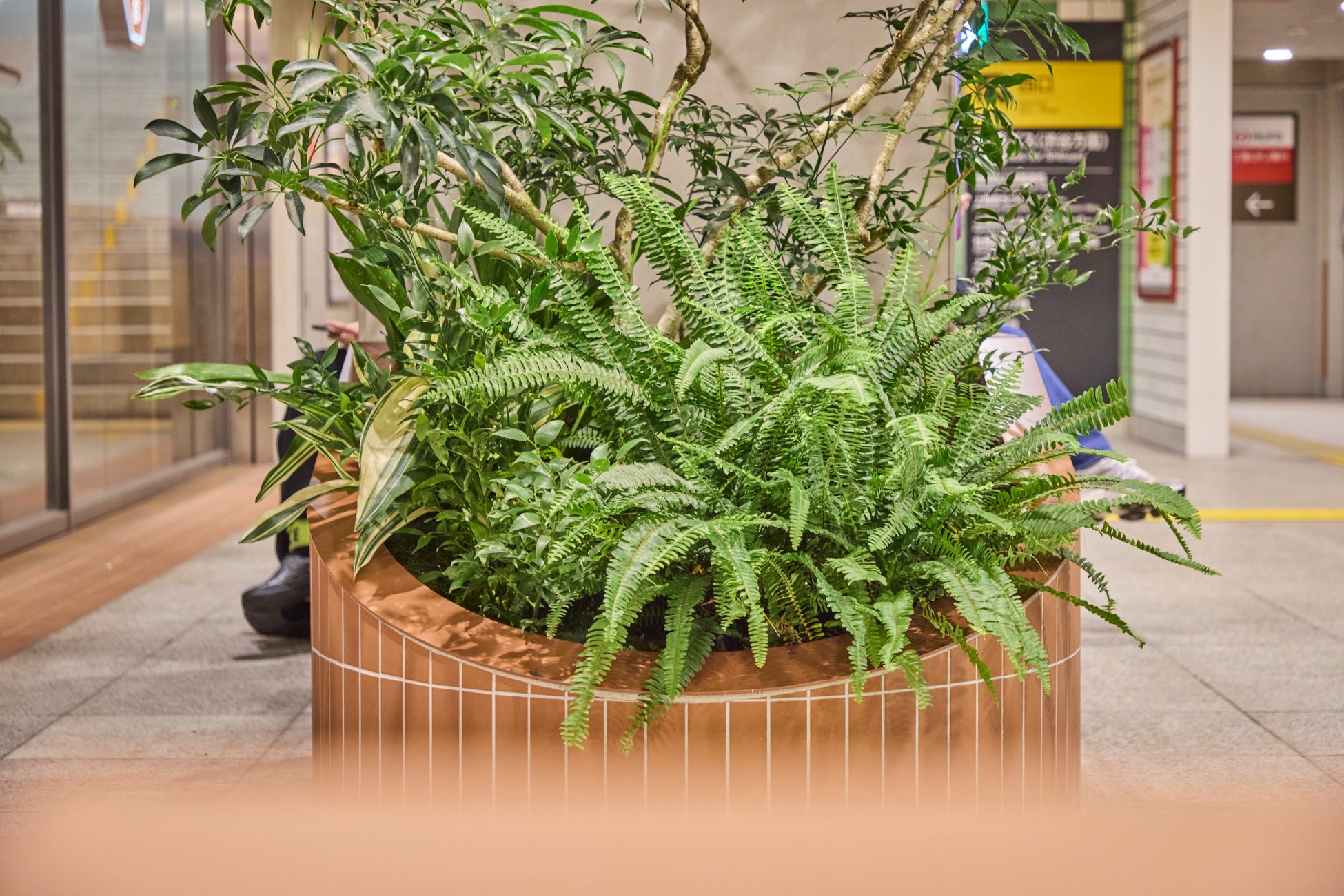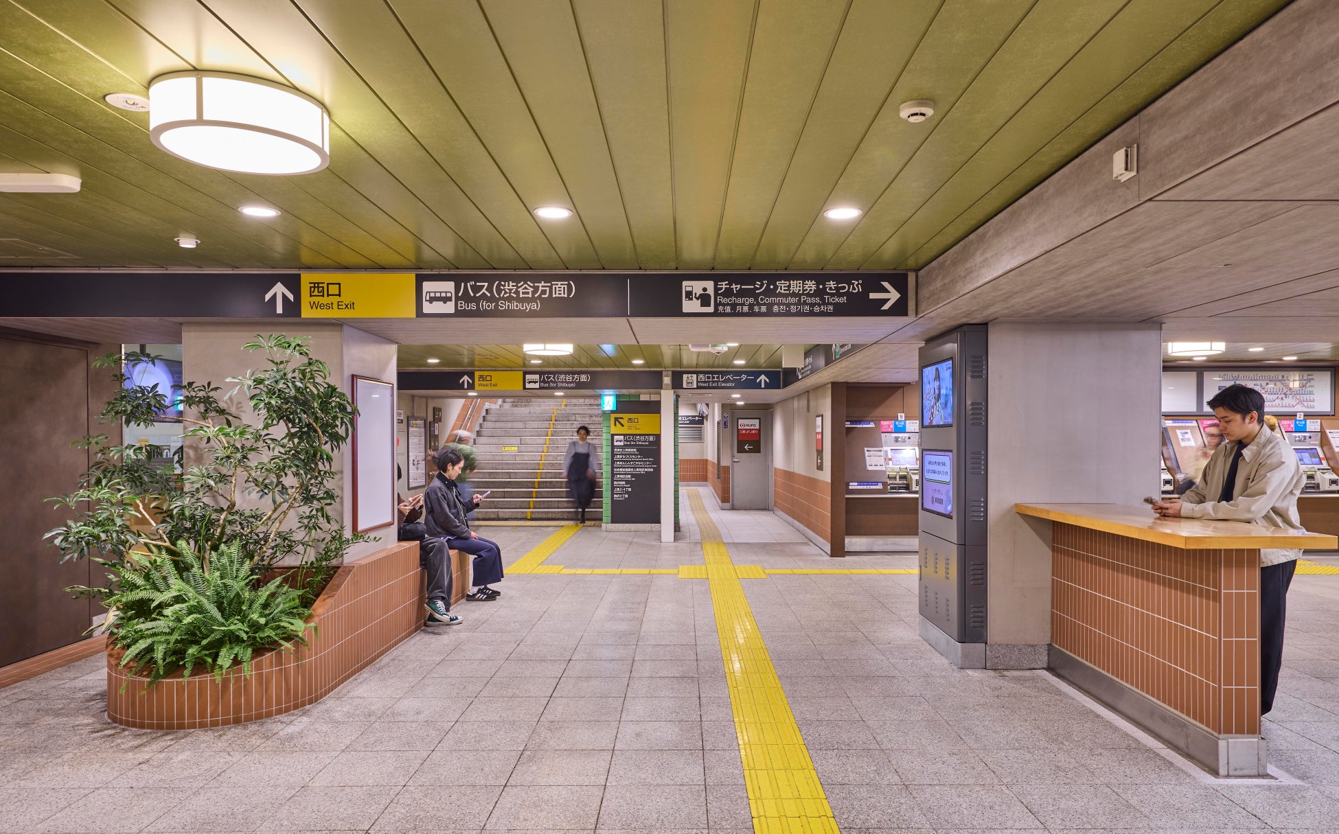駅構内の天井は木漏れ日をイメージしたグリーン調に。また地下駅には珍しい取り組みとして、地下駅構内に植栽を配置し、明るいグリーンや柔らかい質感の植物で駅構内を緩やかに繋いでいます。