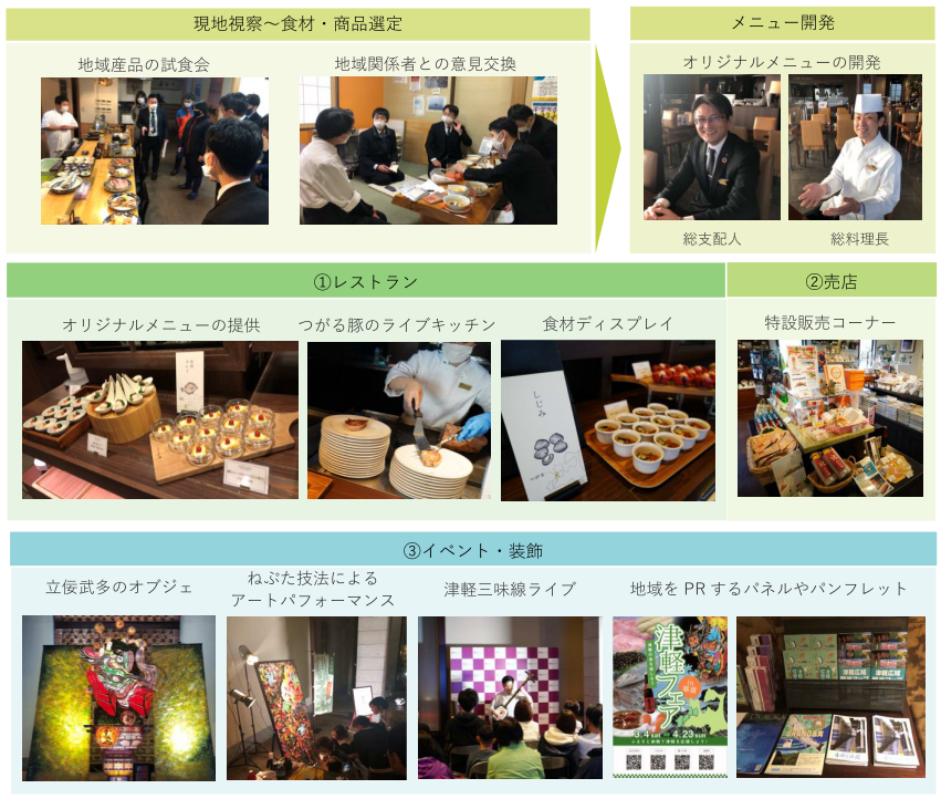 第一弾として、青森県日本海側の4自治体(五所川原市・つがる市・鰺ヶ沢町・深浦町「以下「津軽エリア」)の協力のもと、「津軽エリアの地域資源のブランディング・販路拡大」を目的に本フェアを開催致しました。津軽エリアは、世界遺産・白神山地、広大な津軽平野、日本海に注ぐ岩木川など「海・山・川」に囲まれた自然豊かな地域です。特産品を活かしたオリジナルの食事メニューや立佞(たちね)武(ぷ)多(た)・津軽三味線のイベント等、津軽エリアの魅力を最大限に活かした内容となるように、地域の皆さまと取り組みました。