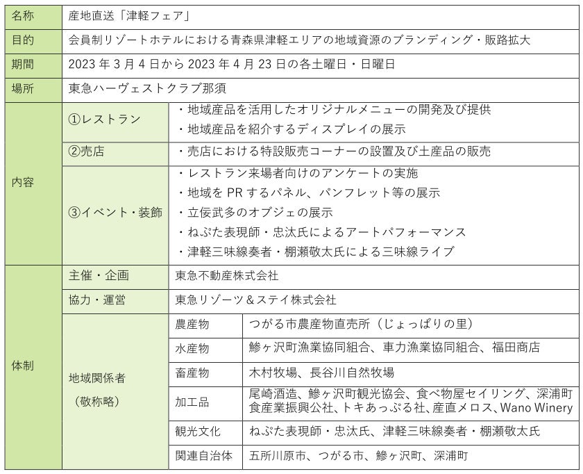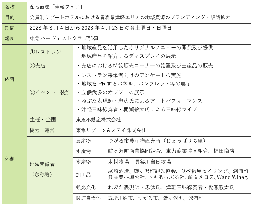 第一弾として、東急リゾーツ&ステイ株式会社(本社:東京都渋谷区、代表取締役社長:粟辻󠄀 稔泰、以下「東急リゾーツ&ステイ」)と連携し、栃木県那須町にある会員制リゾートホテル「東急ハーヴェストクラブ那須」において、産地直送「津軽フェア(以下、「本フェア」)」を開催しました。