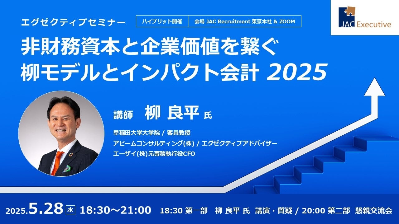 世界11ヵ国で人材紹介事業を展開する業界大手の株式会社ジェイ エイ シー リクルートメント(代表取締役会長兼社長:田崎ひろみ、以下JAC)は、2025年5月28日(水)に「柳モデル」を提唱した元エーザイCFOで早稲田大学客員教授の柳良平氏を講師に迎え、昨年も好評をいただいた『非財務資本と企業価値を繋ぐ柳モデルとインパクト会計』をテーマに、第14回Executive seminarを開催します。セミナー参加は無料です。