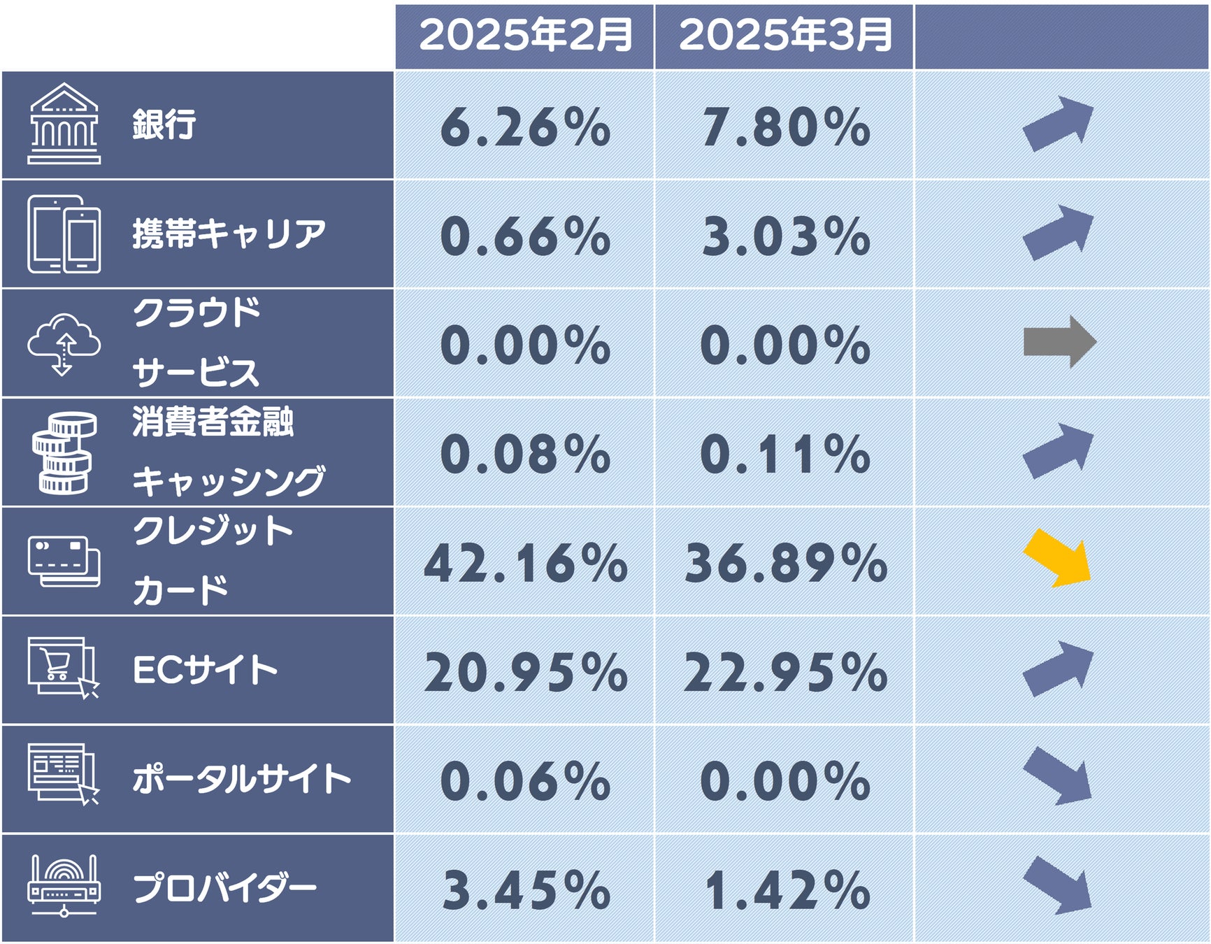 3月度はクレジットカードの構成比が下がり、ECサイトや銀行などの構成比が上昇しています。