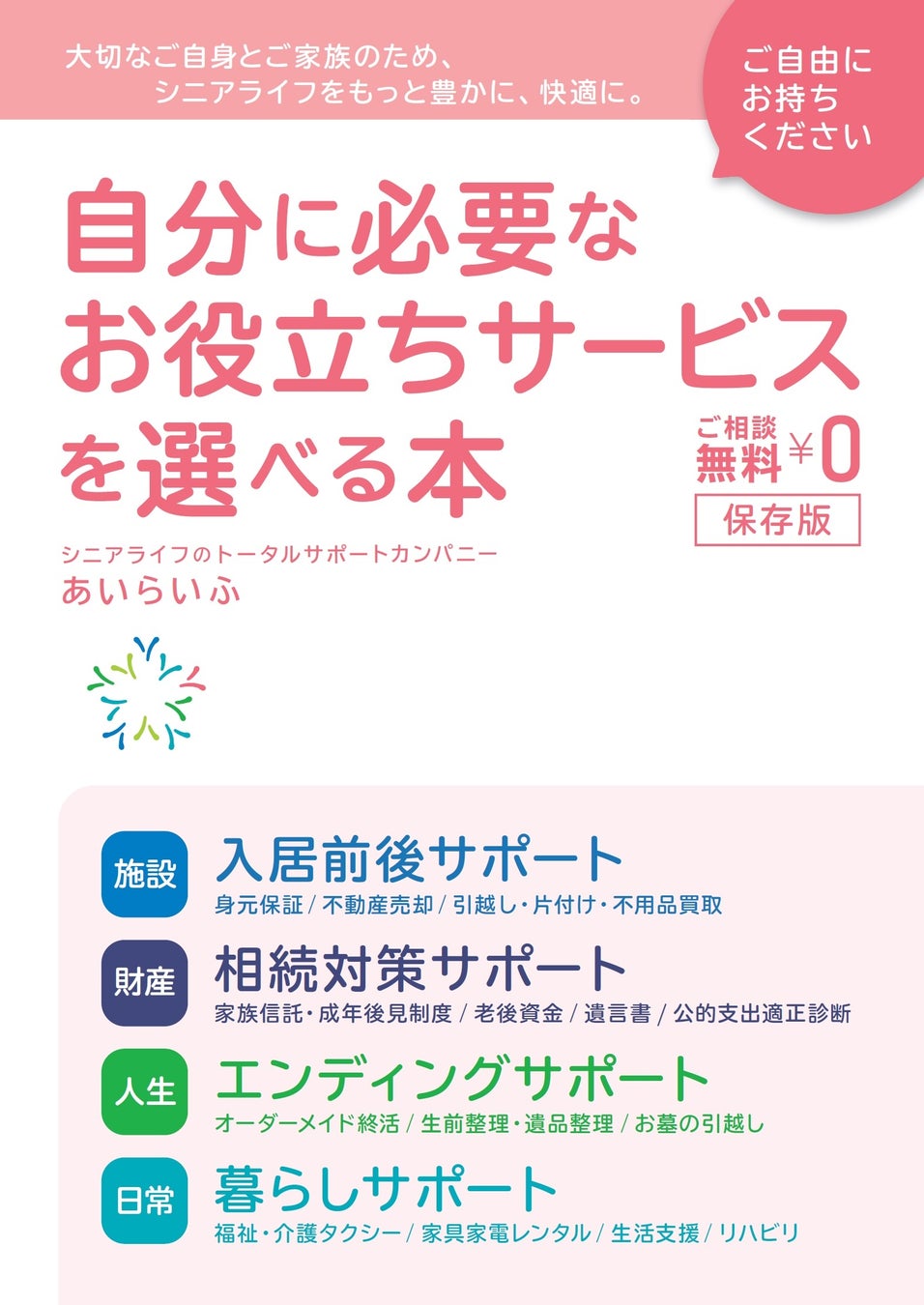 シニアライフのトータルサポート事業を展開する株式会社あいらいふ(本社:東京都新宿区、代表取締役:藤⽥敦史、以下、「あいらいふ」)は、2024年10月9日(水)に、シニア向けサービスガイド『⾃分に必要なお役⽴ちサービスを選べる本』を発⾏いたします。