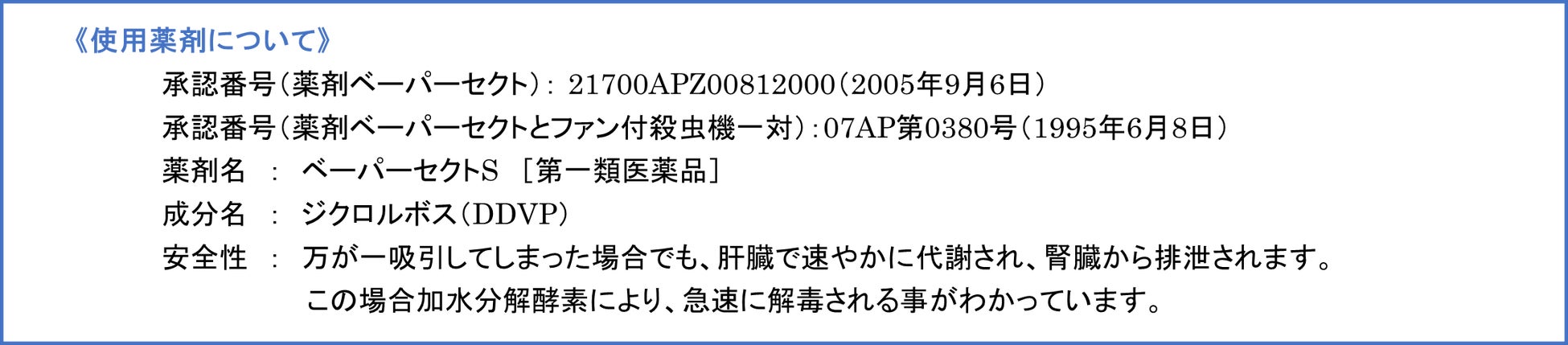 ※ 日本で初めて薬剤(べーパーセクトS)と機械の一対で厚生労働省(旧厚生省)から承認(承認年月日:1995年6月8日 (07AP)第0380号)。