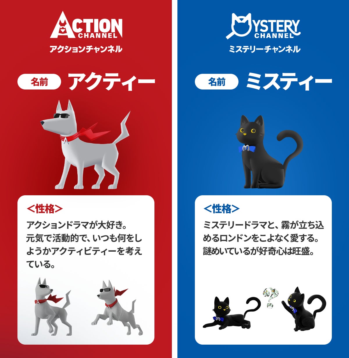 昨年10月にチャンネル名を「アクションチャンネル」「ミステリーチャンネル」にリニューアルし、よりチャンネルに親しみを持っていただきたいという思いでキャラクターを誕生させました。アクションチャンネルのキャラクター(犬)は、元気で活動的な意味を込めた「アクティー」に、ミステリーチャンネルのキャラクター(猫)は、霧が立ちこむように謎めいたイメージから「ミスティー」と命名しました。両チャンネルの“顔”として、視聴者の皆様により身近に感じていただくとともに、長く愛していただけるよう「アクティー」「ミスティー」を通じて様々な展開をしてまいります。