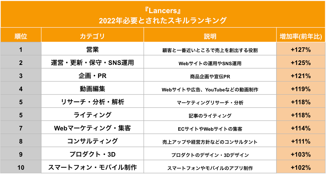 ランサーズ、フリーランスが「2022年必要とされたスキルランキング」を公開〜コロナ禍で発注が増加した職種がトレンドからスタンダードに?営業・動画編集・SNS運用などが上位を占める~