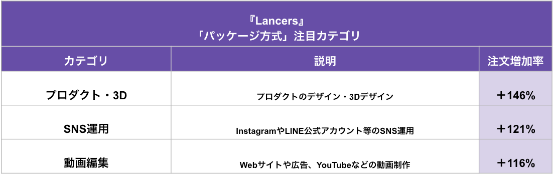 また、「Lancers」でスキルを購入・販売できる「パッケージ方式」で注文数が増加している注目カテゴリをご紹介します。