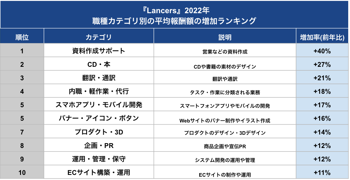 ランサーズ株式会社(本社:東京都渋谷区、代表取締役社長 執行役員CEO:秋好 陽介、東証グロース:4484、以下『ランサーズ』)は、フリーランスマッチングプラットフォーム「Lancers」において集計したフリーランスが「2022年必要とされたスキルランキング」を公開いたします。
