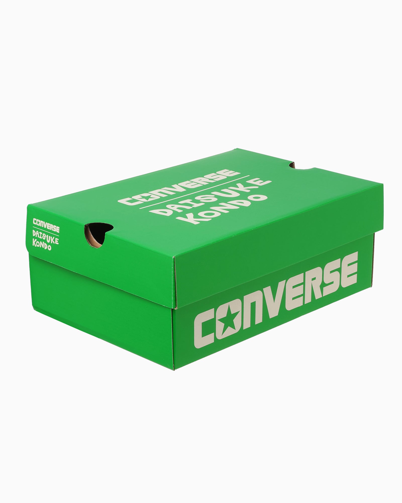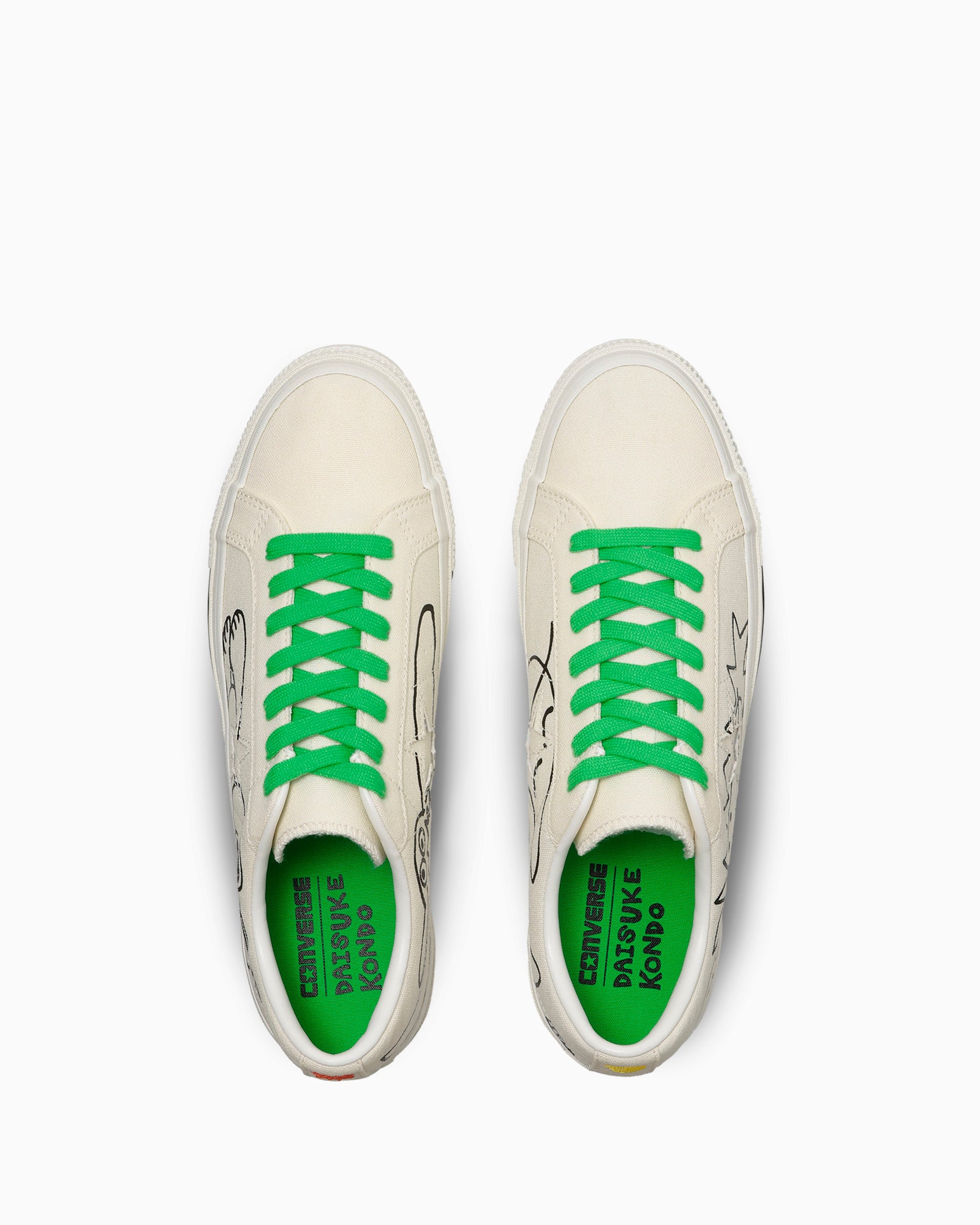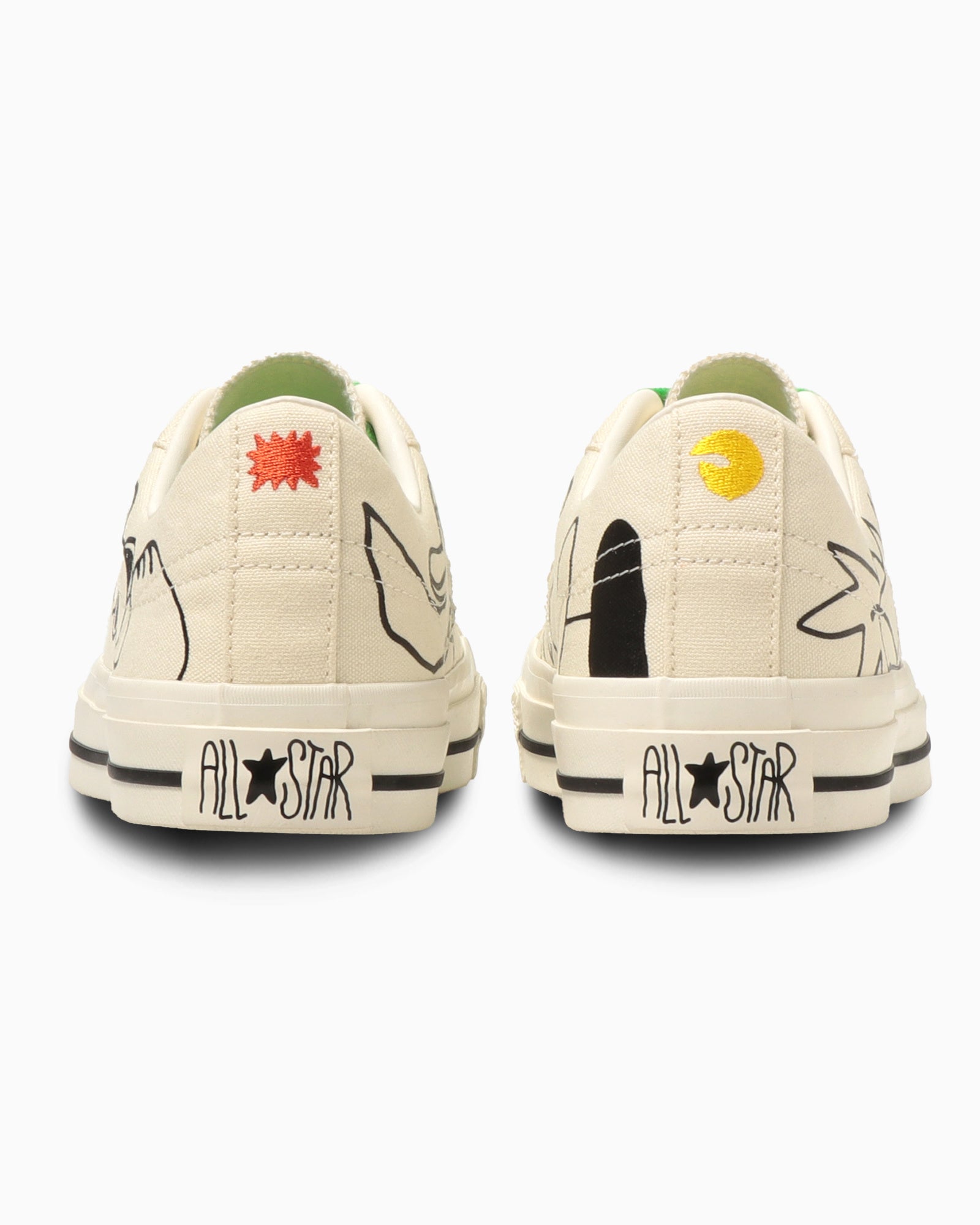 本モデルは、ワンスターキャンバスをベースに、遊び心あふれるイラストや立体作品で注目を集めるDAISUKE KONDO氏の世界観を落とし込んだ一足です。キャンバスアッパーにはキャラクターをプリント。左足外腰にクマ、左足内腰にペンギン、右足外腰に月、右足内腰に太陽を配したアシンメトリーなデザインが特徴です。かかとには左右それぞれ太陽と月のモチーフを刺繍で施しました。ビビッドなグリーンのインソールにはDAISUKE KONDO氏のサインをプリントし、ヒールラベルには書き下ろしのALL STARロゴを採用しています。ホワイトのスペアシューレースが付属し、オリジナルカートン入り。