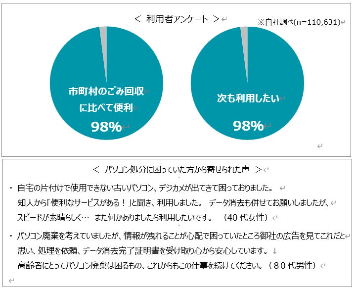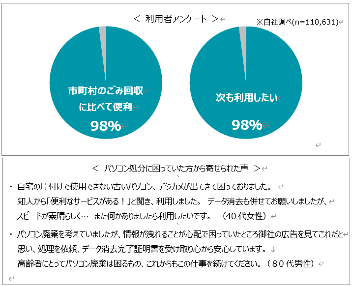 利用者アンケートでも98%の方が「市町村のごみ回収に比べて便利」、98%が「次も利用したい」と回答し、満足度の高いサービスとして評価をいただいています。