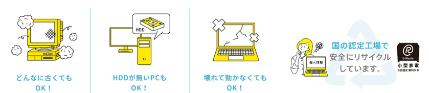 宅配便リサイクルは、事前に申込み後、希望日時(年中無休・最短翌日)に佐川急便がご自宅から回収し、国の認定工場で確実に処理を行います。回収から処理完了まではトレーサビリティーを管理しマイページ/メールで提供しています。また、パソコンについては多くのデータが含まれることから、データ消去ソフトを無償提供、希望者にはデータ消去サービスを提供しています。