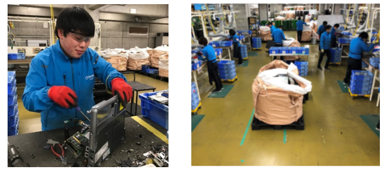 回収したパソコンは、セキュリティが確保された専用施設に運ばれ、1台ずつ手作業で解体し再資源化処理を行います。この手作業の工程で約30人の知的障がいのある方が活躍しています。回収量が増えれば、障がい者の雇用も拡大するモデルを目指しています。