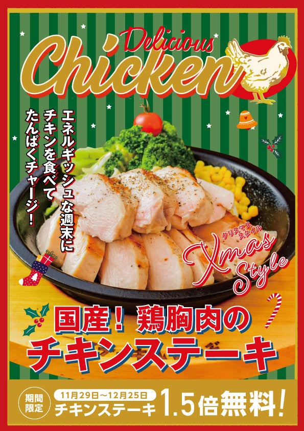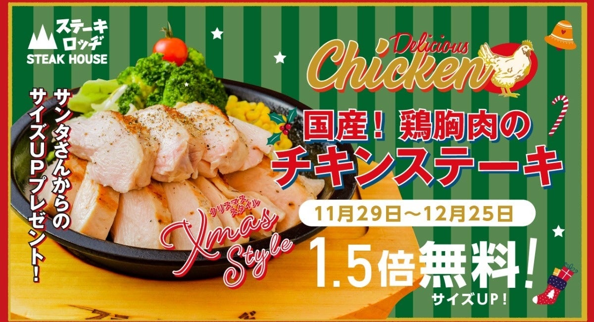 「いい肉の日」といえば、やっぱりステーキ! 一方で、街は少しずつクリスマス色に。『ステーキロッヂ』では、そんな冬のはじまりにぴったりな「国産チキンステーキ」を、心ゆくまで楽しめる「チキンステーキ1.5倍無料キャンペーン」をご用意いたしました。いつもの料金で肉量1.5倍に増量!この機会にお腹いっぱいお楽しみください。