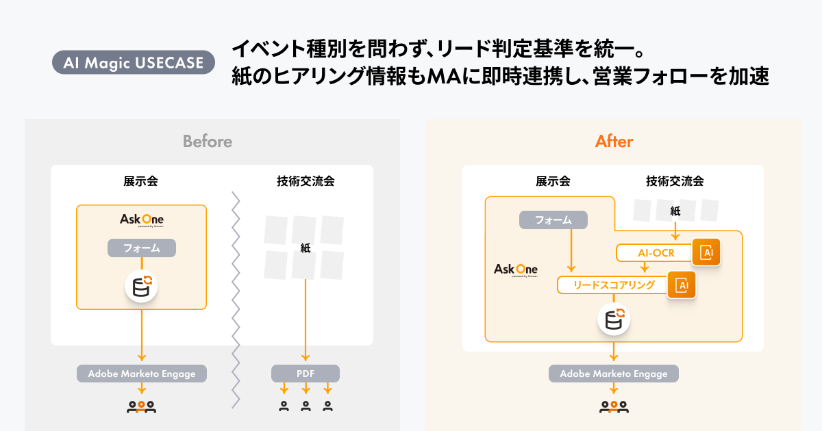 今回、紙のヒアリングシートはそのままに、 その情報を Adobe Marketo Engage に統合することで、マーケティング施策の成果を把握しやすくし、営業成果につなげていくことを目的に、AI-OCR機能を搭載した Ask One の「AIマジック」の利用を決定しました。