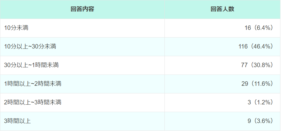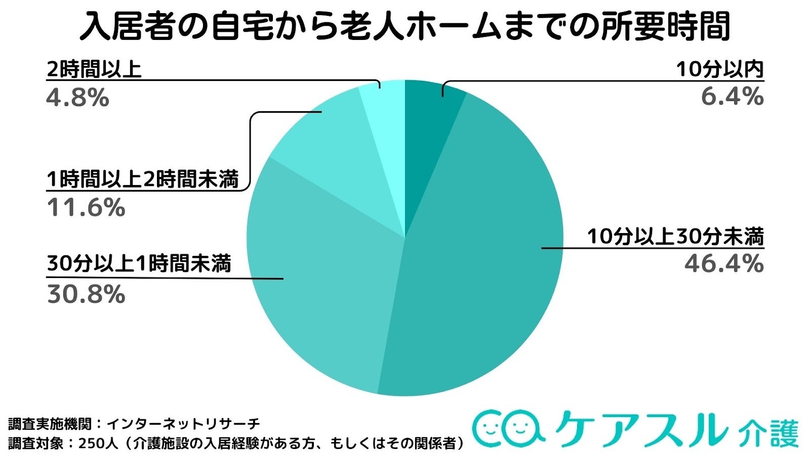 入居者の家族の自宅から老人ホームまでの所要時間は「10分以上~30分未満」が46.4%で最も多く、「10分以内」の6.4%を足すと、半数近くの方が自宅から30分以内の距離の老人ホームを選択していることが分かりました。