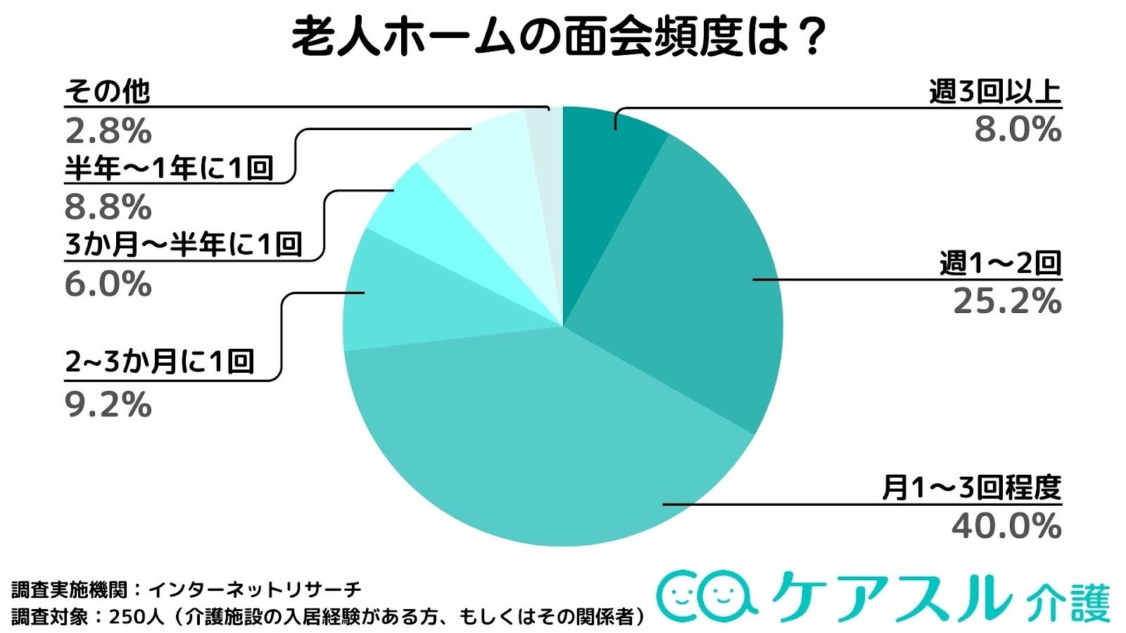 老人ホームの面会頻度として最も多いのは「月1〜3回程度」の40%であり、全体の約7割が少なくとも月に1回は面会に訪れている。