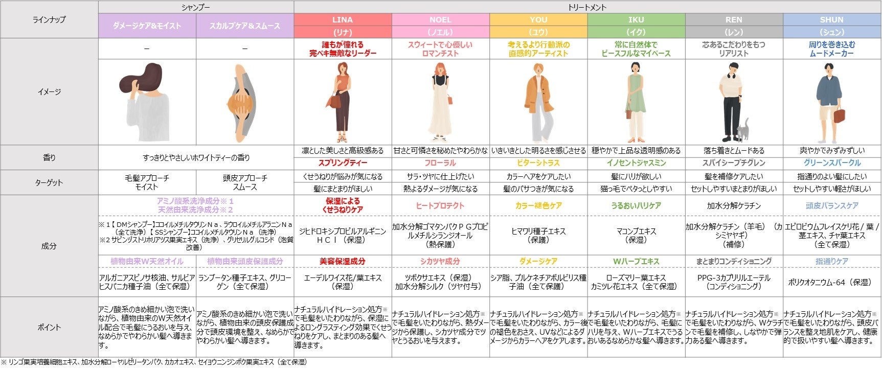 何でもこなせる完璧主義者の美容大好きな「リナ」は、美容保湿成分を配合し特に髪悩みで多いクセやうねりケアが得意。