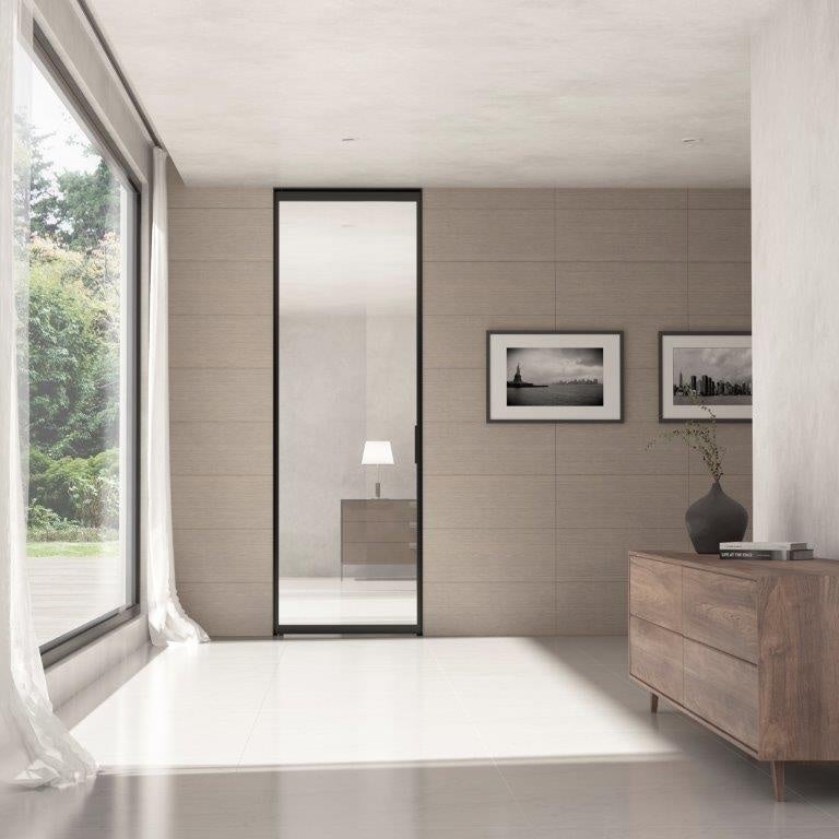 16mmの細いフレームにガラスをはめ込んだデザインのガラスドア。空間に繋がりを生み出し、遮蔽するものが何も無いという上質な空気感を醸し出します。