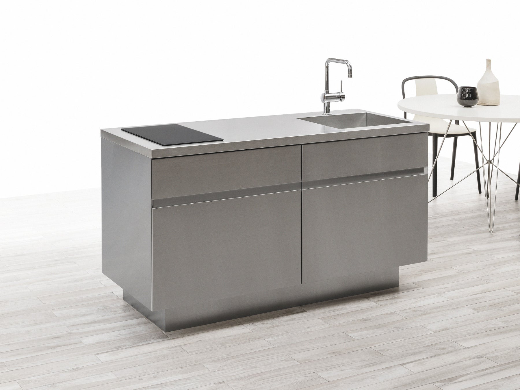 全体にステンレスを採用し、無駄をそぎ落としたデザインのコンパクトキッチン。四隅の角がシャープなシンクや、小口が見えない「留め加工」の仕上げが特長です。