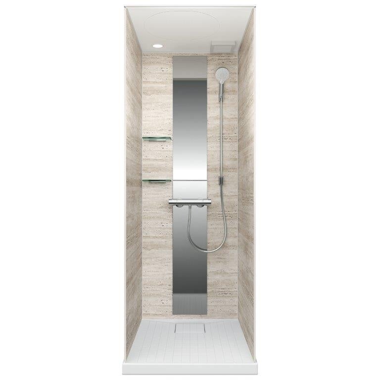 省スペース設計でありながら、贅沢感のあるデザインのシャワーブース。オプションで、ゆったりとしたバスタイムを演出するレインシャワーをご選択可能です。