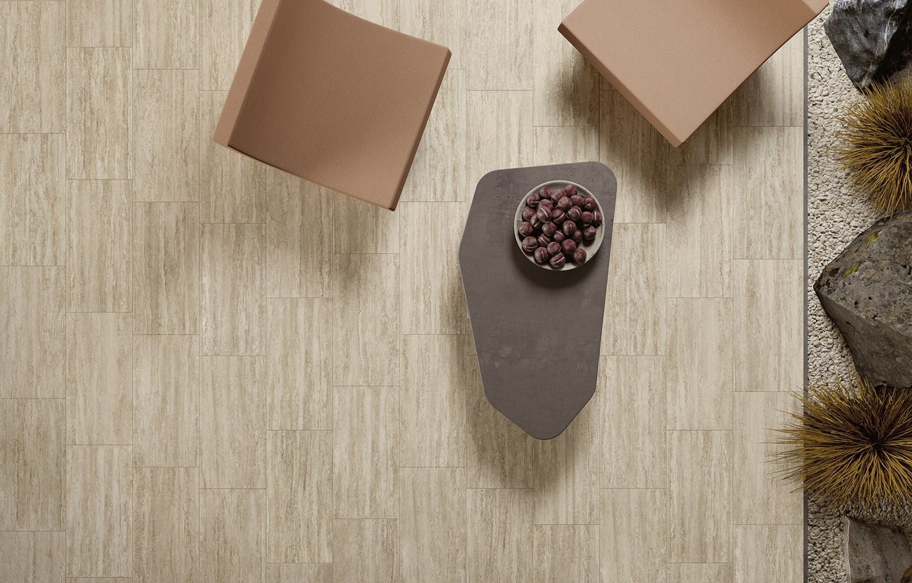 エレガントなトラバーチンの縞目を堪能できるタイル。大胆に流れるトラバーチンの脈模様が見えるよう、石目に沿って刃を入れた「ベインカット」の本石をモチーフにデザインしました。