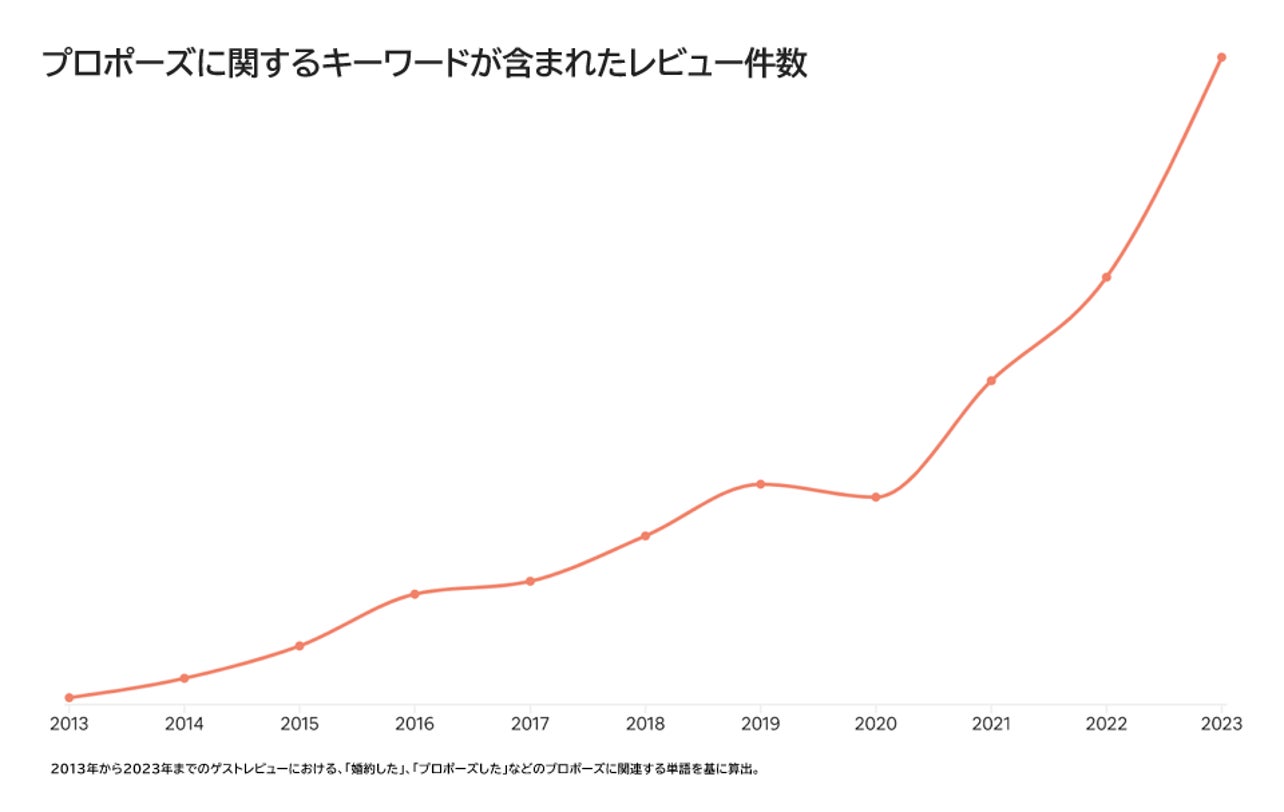 ²過去10年間で、「プロポーズ」、「婚約」、その他「結婚を申し込まれた」などの文言が含まれた「ゲストチョイス」リスティングのレビューに基づく。