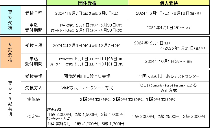 夏期受検の申込みは、団体受検2/1~、個人受検4/1~ 受付開始