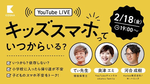 【2/18(金)19:00】子育て情報メディア「KIDSNA」YouTube LIVE配信!「子どものスマホっていつから必要??」