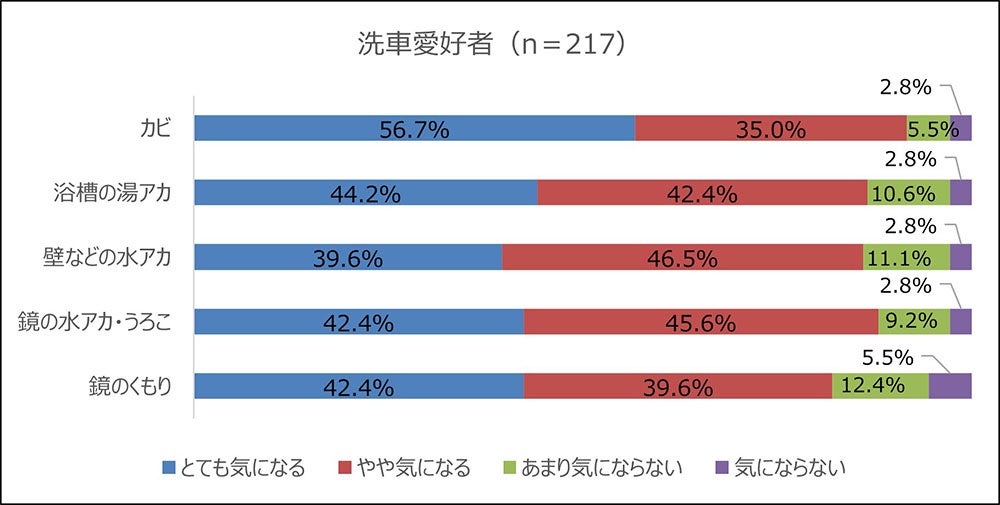 洗車愛好者はお風呂の様々な汚れに対し「とても気になる」人が多い