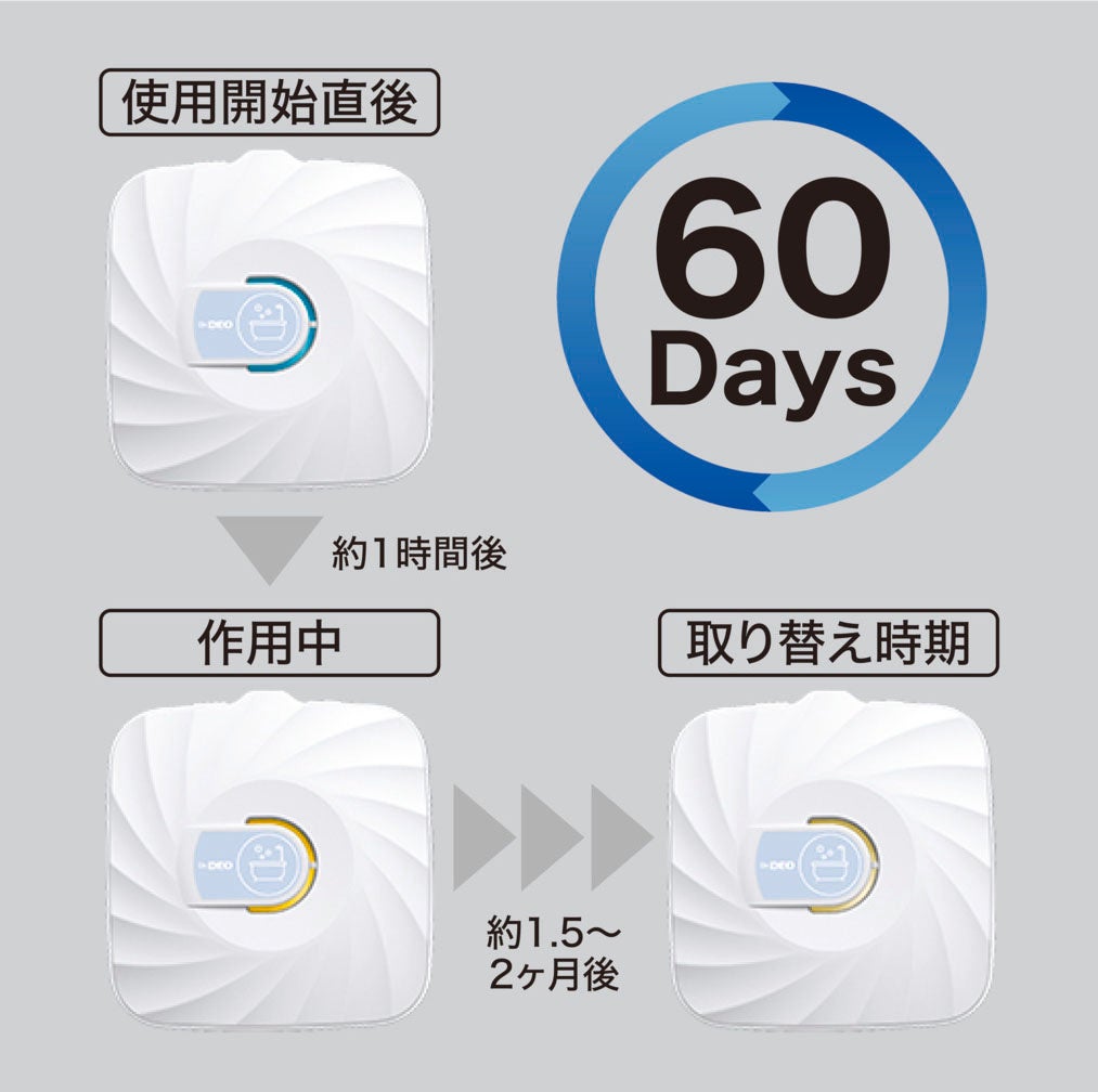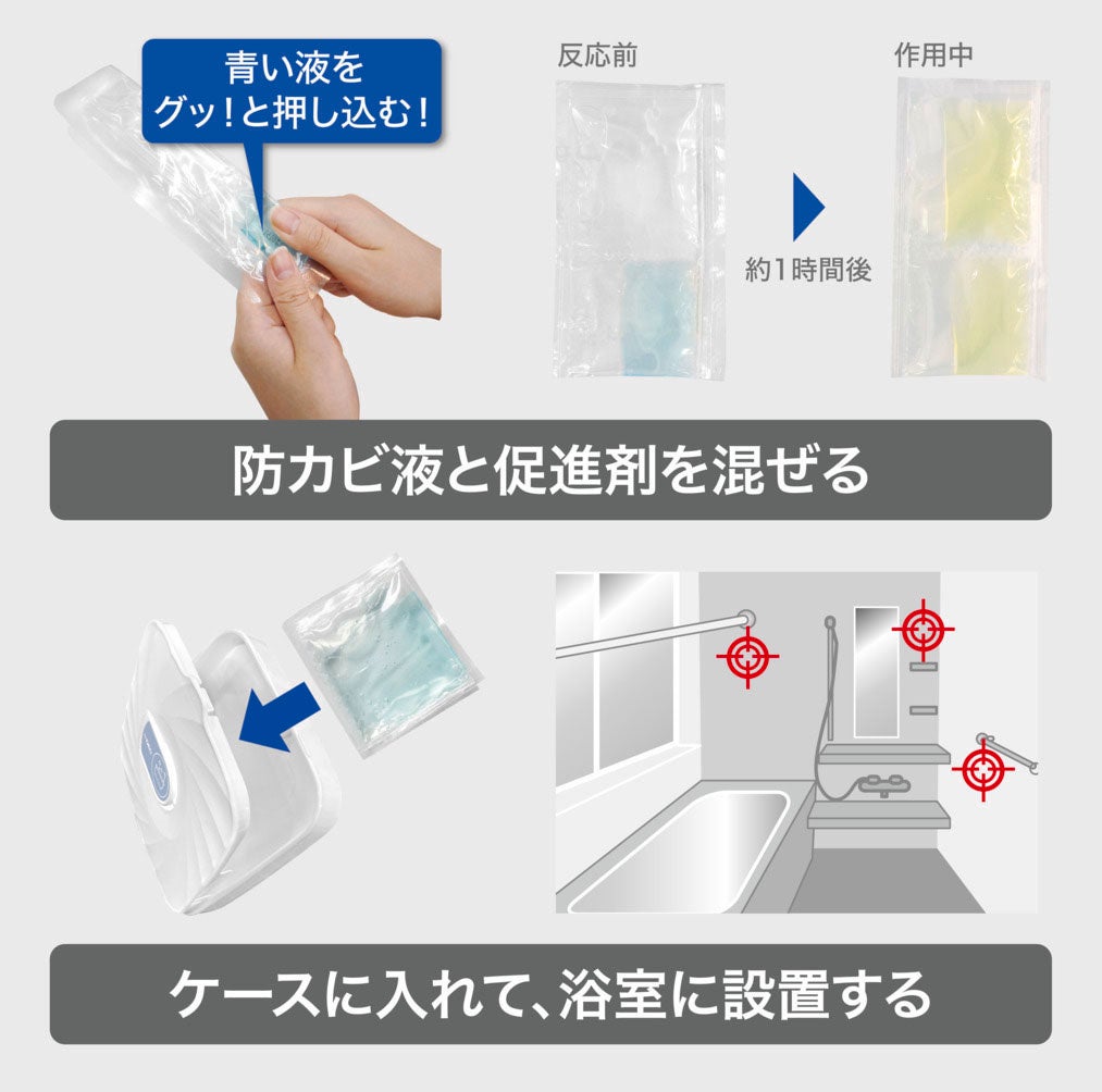 気化した二酸化塩素※が浴室内のカビの成長を抑制し、化学反応でしっかり防カビします。また、ペットや小さなお子様がいるご家庭でも安心してご使用いただくことができます。持続期間は約60日、貼るだけもしくは掛けるだけの簡単設置でカビ取り掃除後のキレイをキープします。無香料のため入浴剤やボディソープの香りを邪魔しません。