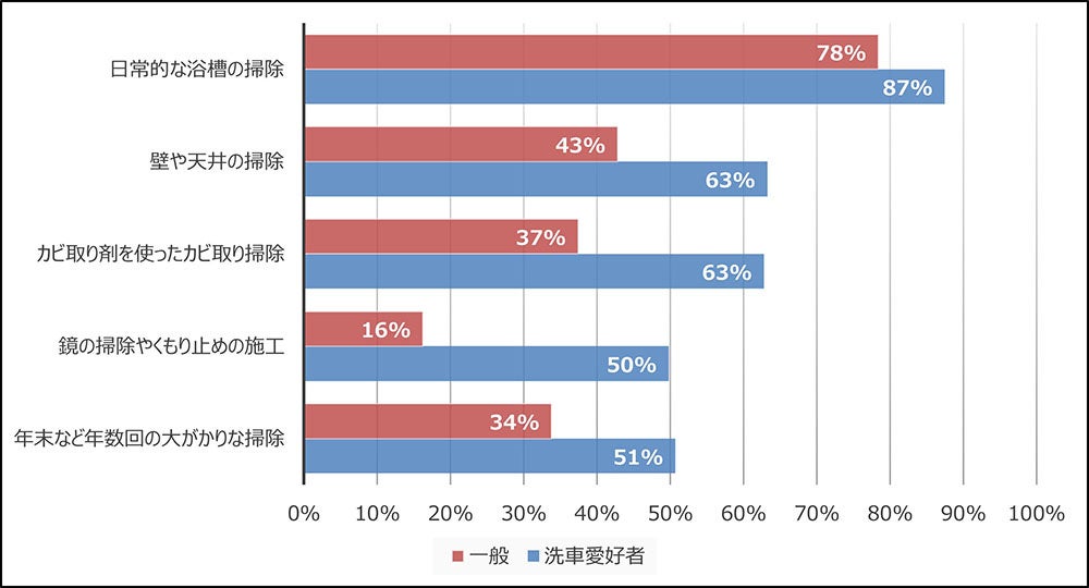 全ての掃除項目において、洗車愛好者が一般より高い数値となった。特に「鏡の掃除やくもり止めの施工」については3倍以上に。また、日常的な浴槽の掃除に加え、壁や天井の掃除やカビ取り剤を使ったカビ取り掃除など、ひと手間加えた掃除についても、洗車愛好者の半数を超える人がおこなっていることが分かった。