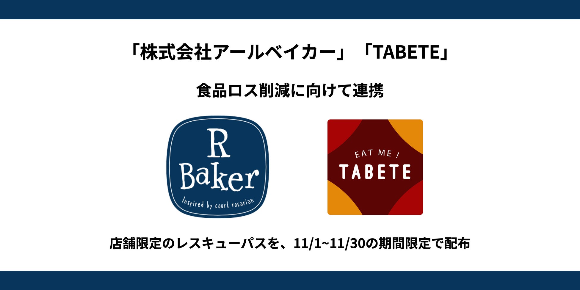 株式会社アールベイカーとTABETEが食品ロス削減に向けて連携。11月1日(火)〜11月30日(水)の期間中に使用できる限定レスキューコードを配布。