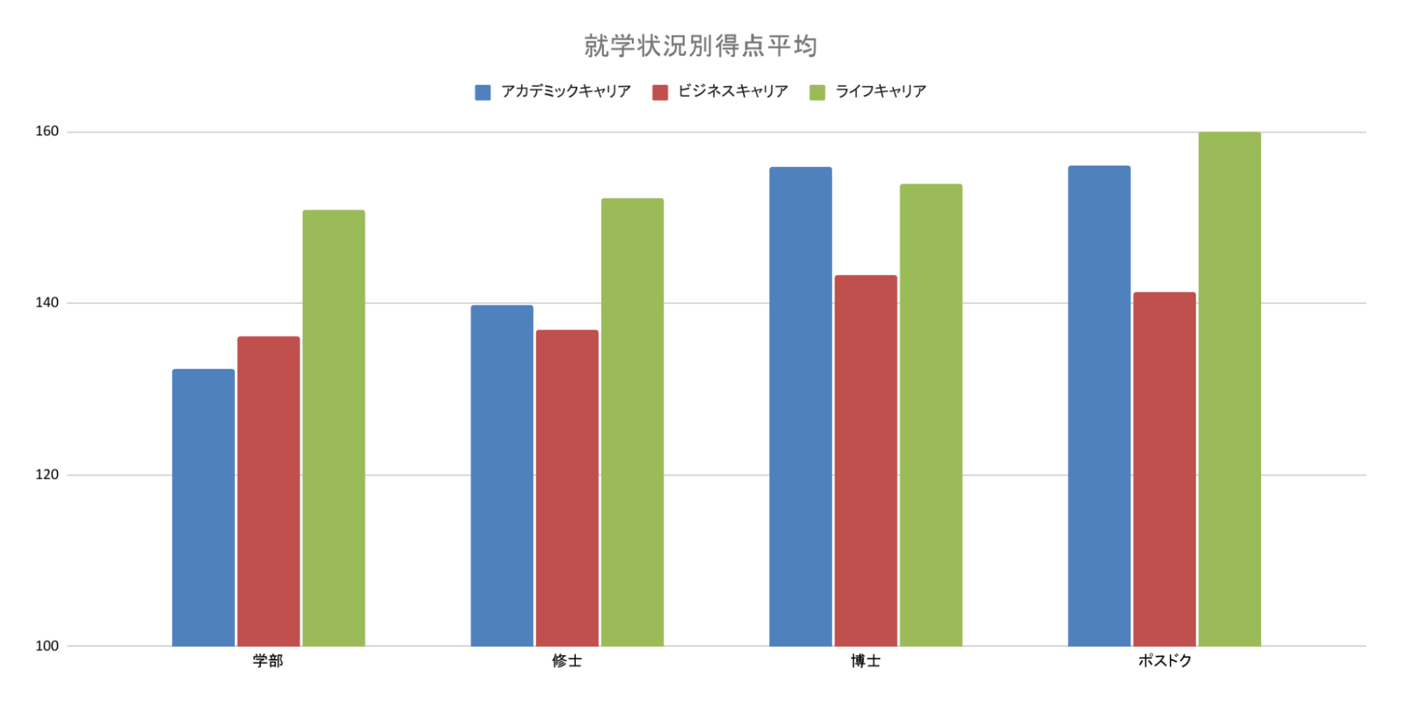 アカデミックキャリアの得点は「探求分析力」「計画遂行力」の能力で構成されており、利用者全体の平均得点は「探求分析力」が最も高い傾向にあります。利用者のほとんどが大学院生であり研究に従事しているという特性から、知識や情報を取り入れ課題を解決する力である探求分析力が身についていると考えられます。