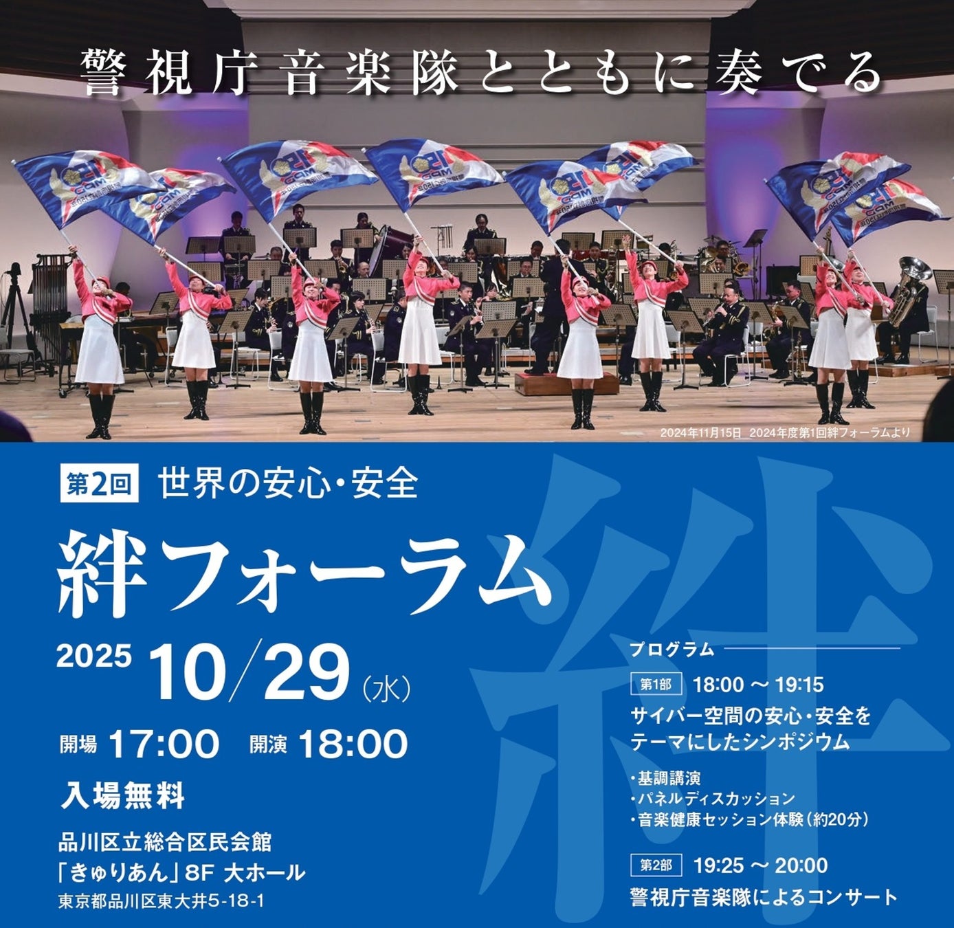 <第1部>シンポジウム ・基調講演「サイバー空間における安心・安全」 警察庁サイバー警察局サイバー企画課長阿久津正好氏により、現代のサイ バー犯罪の実態と対策の方向性や方針を明らかにする講演。 ・パネルディスカッション「サイバー空間における安心・安全」 海外警察、官公庁、民間企業など多様な視点から意見交換。 <第2部>警視庁音楽隊コンサート 昭和23年の発足以来、都民と警察を結ぶ「音の架け橋」として活動する警視庁音楽隊による演奏と、カラーガード「MEC」による華やかなフラッグ演技を披露。 |