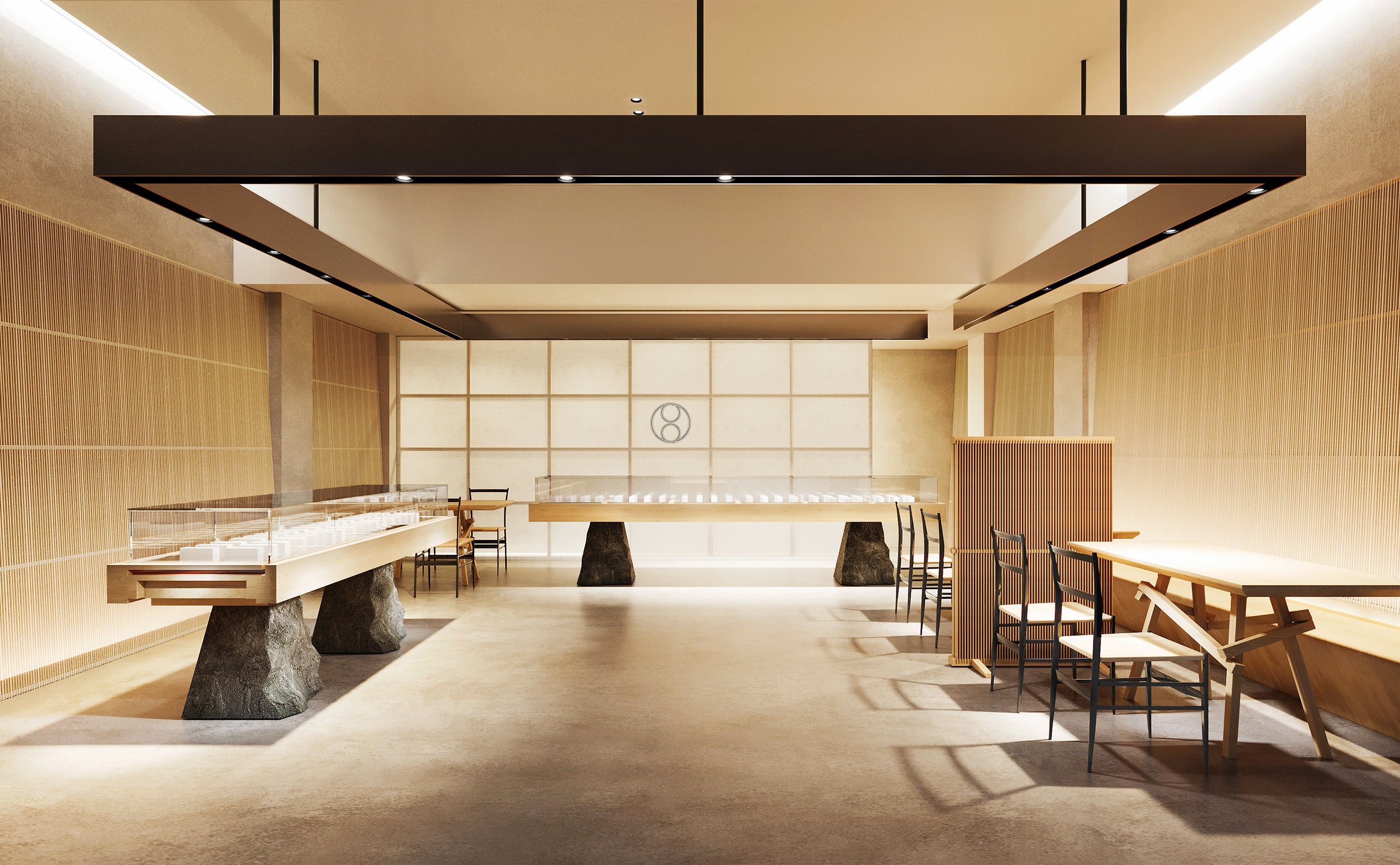 店内は由緒ある寺社仏閣で馴染み深い枯山水や、京都の街中の風景の一つでもある町屋風情を映し出す犬矢来をモチーフとして取り込み、伝統と洗練が織りなす、粋で上品な空間を造り出しました。