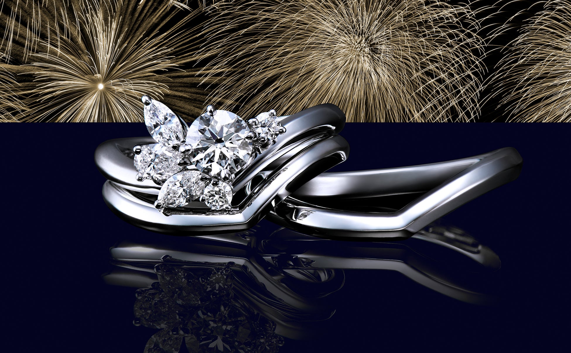 「HANABI」シリーズでは、あでやかな大輪の花火をイメージしてデザインされた繊細かつゴージャスな婚約指輪や、ふたりを包む夜風の流れを映した結婚指輪など、華やかで個性的なブライダルリングが取り揃えられています。