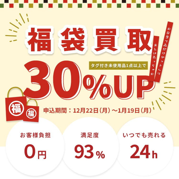 株式会社ベクトル(本社︓東京都港区、代表取締役︓村川智博)が運営する宅配買取サービス「フクウロ」は、2025年12月22日(月)から2026年1月19日(月)までの期間限定で「福袋買取キャンペーン」を開催します。お客様は、万が一福袋が“ハズレ”の場合でも、「フクウロ」が買い取ることを前提に、安心して福袋をお楽しみいただけます。