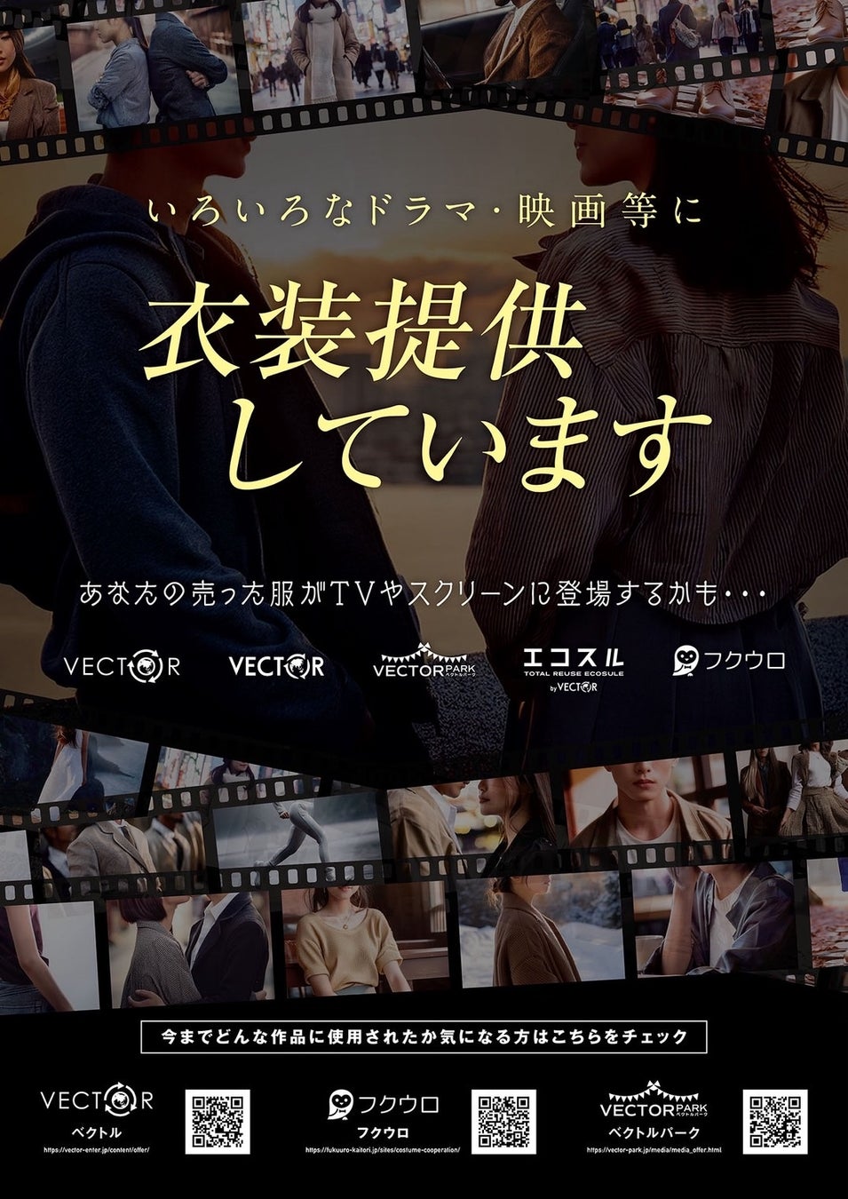現在ベクトルはドラマや映画など数多くの作品に衣装協力しています。お送りいただいたお品物が撮影衣装として生まれ変わるかもしれません。